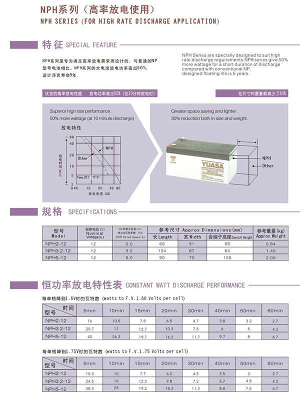 NPH系列是專為滿足高率放電需求而設計的。與普通的NP型號電池相比,NPH系列的大電流